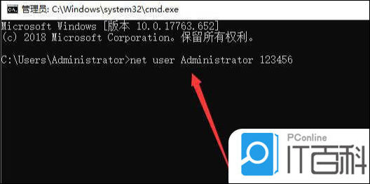 5. 然后输入:net user Administrator 123456命令,回车即可将Administrator账户的密码修改为123456,如果想更换其他账户,操作方法类似。