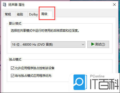 2. 在声音属性界面中,我们点击“高级”菜单选项,然后点击页面中“还原默认值”按钮;