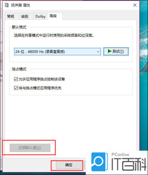 3. 在点击了还原默认值按钮之后,我们就可以还原声音播放设备的采样频率和位深度,然后点击“确定”按钮保存当前设置。