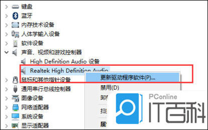 2. 在设备管理器中,我们双击打开声音设备,然后在所列的硬件中击右键,选择“更新驱动程序”;