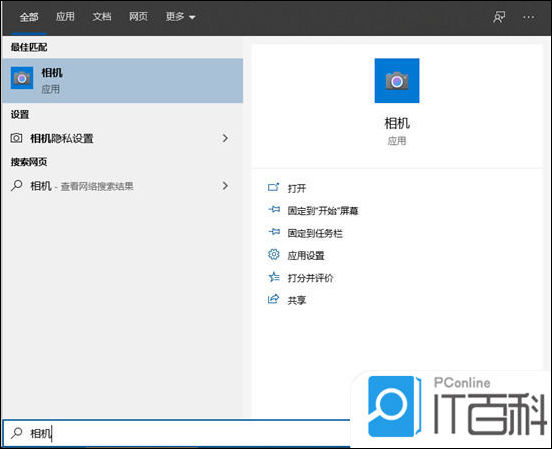 5. 或者直接点击开始菜单旁边的搜索框,输入“相机”搜索打开该应用程序即可;