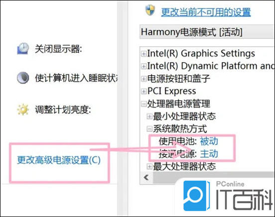 3. 最后点击更改高级电源设置,并把散热方式全部设为被动即可把风扇调为静音。