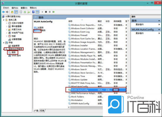 2. 进入管理列表后,依次点击服务和应用程序-服务,右侧找到WLAN AutoConfig双击打开改为自动,并且点击左上角的重启动即可。此法一般可解决wifi服务因错误导致无法启动。