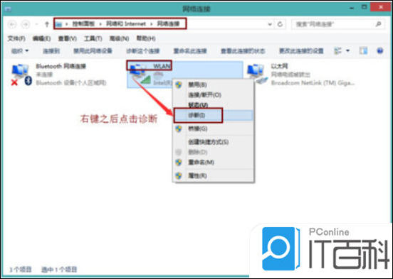 3. 鼠标右键wifi那个连接,再点击里面的诊断。这时电脑会自动诊断连不上wifi的原因并修复连不上wifi的错误。此法一般可修复DHCP错误。
