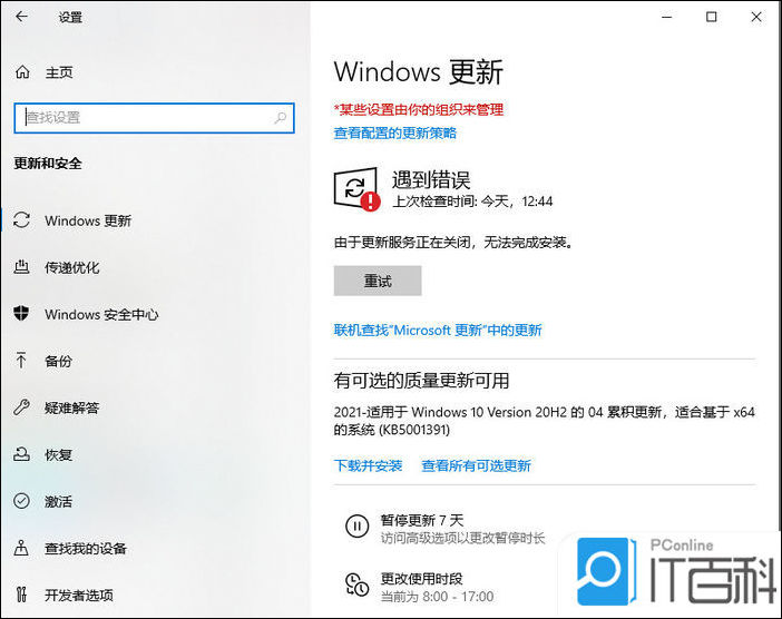 5. 之后进行重启电脑。然后我们重新打开windows更新的页面,就会发现系统提示“某些设置由你的组织来管理”,之后win10系统电脑就不会进行自动更新了。