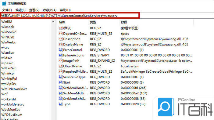 2. 打开电脑的注册表编辑器以后,将上面的路径地址改为:计算机\HKEY_LOCAL_MACHINE\SYSTEM\CurrentControlSet\Services\wuauserv ,跳转到新的文件目录;