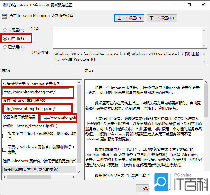 4. 在该功能的页面中,选中“已启用”,然后将“设置检测更新的Intranet更新服务”、“设置Intranet统计服务器”、“设置备用下载服务器”的空白处全部填上任意网站地址,比如:http://www.xitongcheng.com/,之后点击确定;