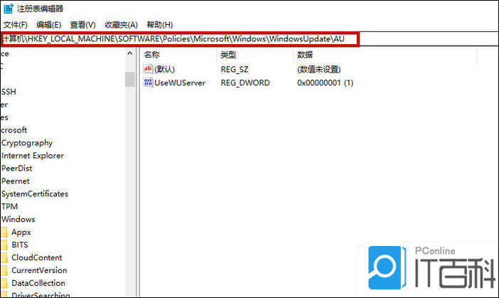 2. 之后将注册表编辑器的文件路径改为:计算机\HKEY_LOCAL_MACHINE\SOFTWARE\Policies\Microsoft\Windows\WindowsUpdate\au;