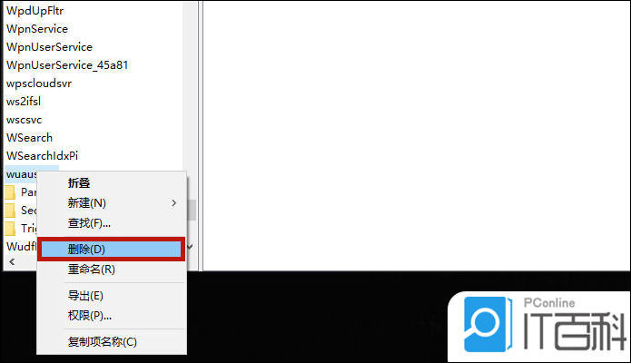3. 之后在页面左侧选中“wuauserv”文件夹,鼠标右键单击该文件夹,选择“删除”;