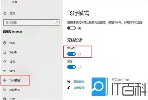 3、页面跳转以后点击飞行模式,将WLAN开关予以开启。