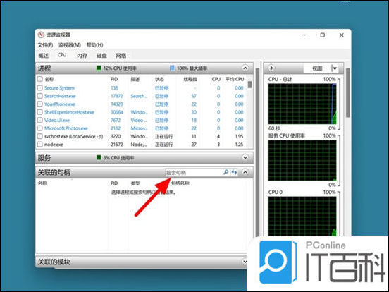 4. 在资源监视器页面,找到搜索句柄栏,按下ctrl+v粘贴之前复制的文件夹名称;