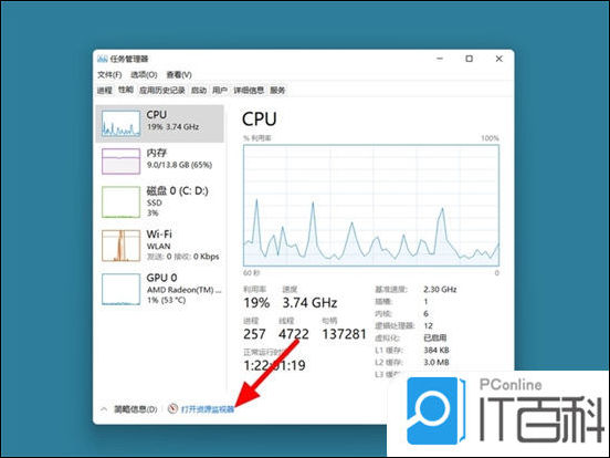 3. 在性能选项下,打开资源监视器;
