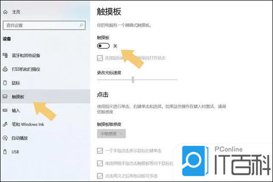 2、 然后依次选择 设备-触摸板 ,将触摸板的“ 开关 ”打开即可。如下图: