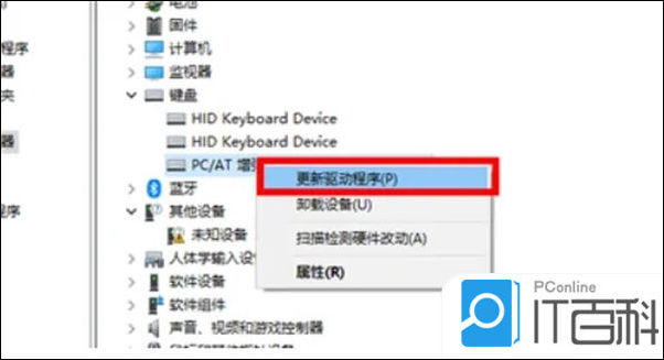 3、 找到对应“ 键盘 ”后,点右键然后点击“ 更新驱动程序 ”即可。