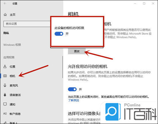 2. 在左侧找到“相机”功能,并点击“更改”,将相机的访问权限打开。