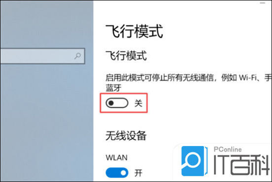 4. 进入页面,把“飞行模式”关闭,下面的 WLAN 开关打开即可解决问题。