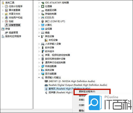2. 设备管理器窗口,在音频输入和输出下,右键点击“麦克风”,在打开的菜单项中,选择“更新驱动程序”。