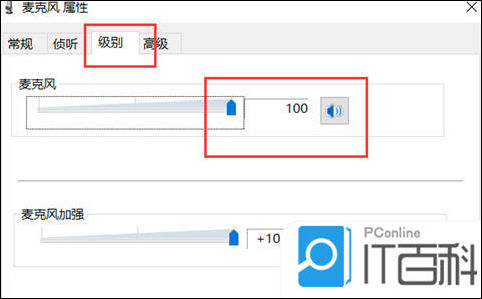 4. 点击切换至“级别”的选项卡调整麦克风音量至最大,如果麦克风声音不够大,我们还可以设置麦克风加强;