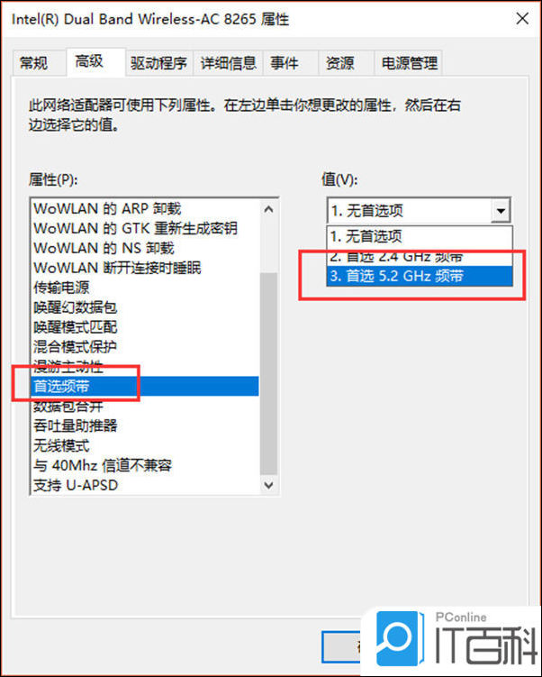 2、 在无线网卡属性中点击“ 高级” 选项卡,在“ 属性” 栏中下拉找到“ 首选频段” 属性,点击并在右侧“ 值” 栏中点击选择“ 3.首选 5.2GHz 频带”, 点击确定即可。(不同电脑显示的界面不同,可能是英文标签,需要自行辨别)