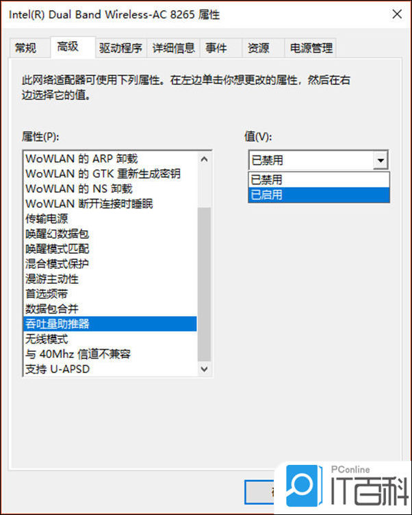 可以在无线网卡属性-“ 高级” 选项卡下,在“ 属性栏” 中找到“ 吞吐量助推器” ,修改右侧值为“ 已启用” ,这样局域网下数据传输性能将得到提高。 (不同电脑显示的界面不同,可能是英文标签,需要自行辨别)