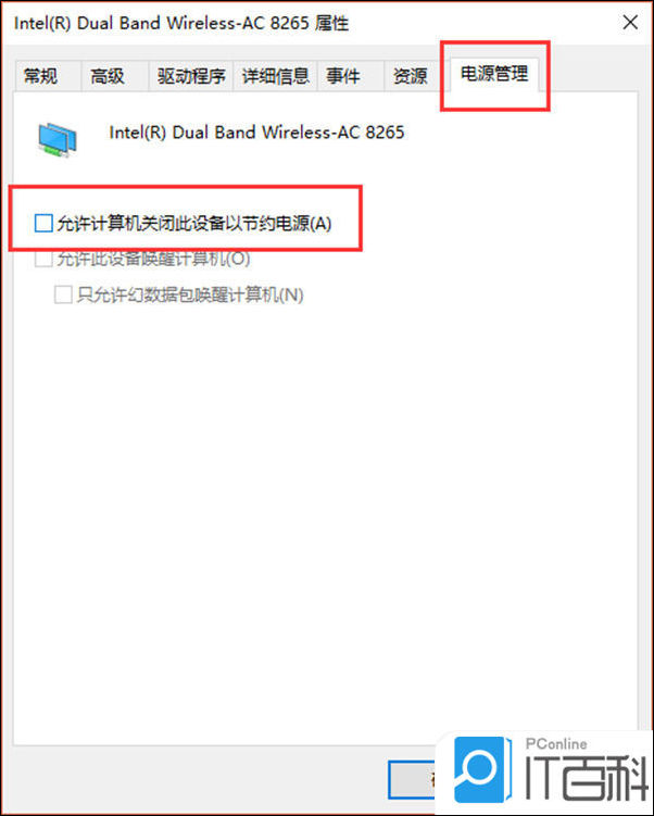 在新打开的属性栏中点击切换到“ 电源管理” 选项卡,取消勾选“ 允许计算机关闭此设备以节约电源”, 并点击确定。