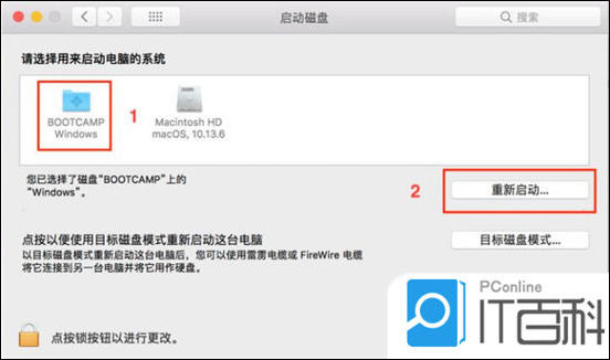 2、 在启动磁盘窗口中,可以看到当前有二个可以启动的系统。选择 BOOTCAMP Windows 点击重新启动,这样后面开机都是从Windows启动了。