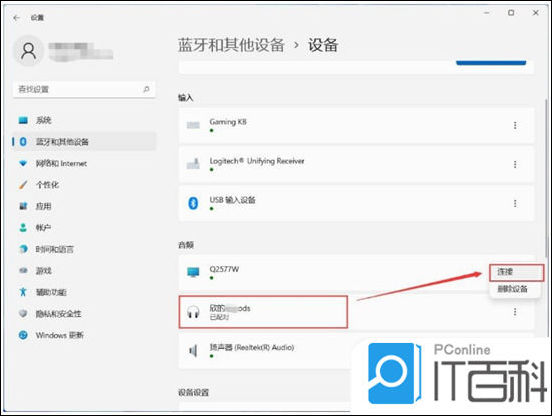 5. 找到要连接的蓝牙设备,点击后面的三个点,选择【连接】,这样就能完成蓝牙设备的连接。如果后续不使用的话,也可以点击删除设备。