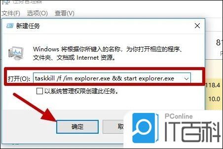 4. 然后在新的界面里在方框里输入“taskkill /f /im explorer.exe && start explorer.exe”后点击选择“确定”按钮即可。