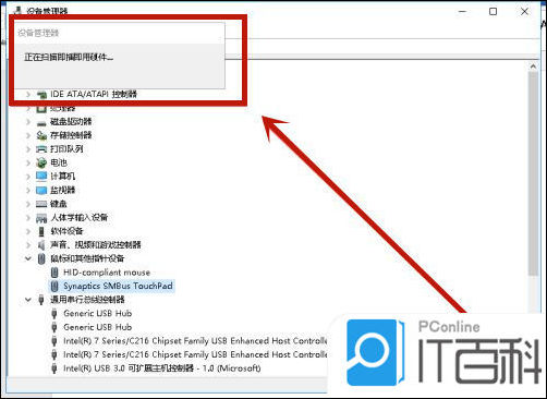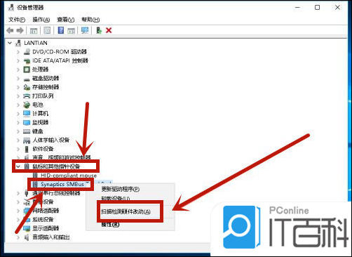 2. 在打开的窗口中点击进入“鼠标和其他指针设备”然后在下拉的选项中右键点击“Synaptis SMBus TouchPad”在打开的菜单中点击“扫描检测硬件改动”;