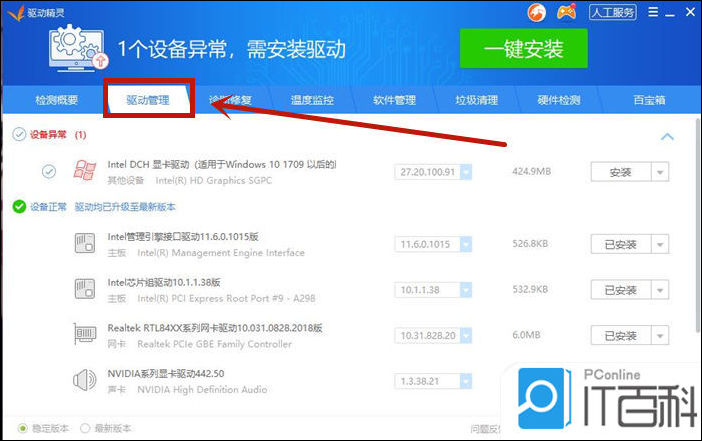 4. 进入之后点击“驱动管理”检测完成之后,会出现哪些驱动没有安装;