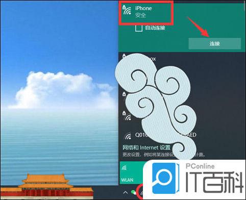 3. 笔记本电脑中点击网络连接图标,打开网络列表之后,找到并点击自己手机的个人热点后,点击“连接”。然后输入个人热点上的无线局域网密码进行连接即可。