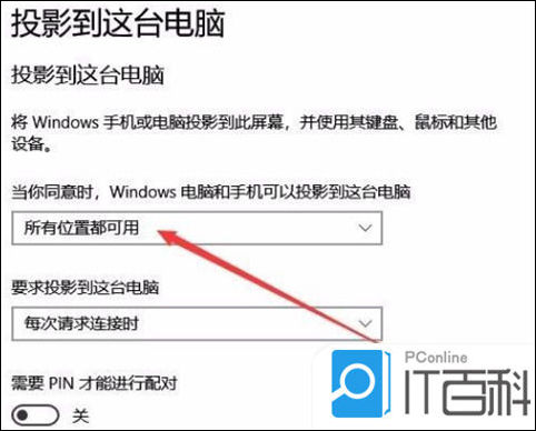 4. 在右侧窗口中点击“当你同意时,With电脑和手机可以投影到这台电脑”下拉菜单,选择“所有位置都可用”菜单项;