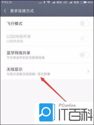 11. 在打开的更多连接方式页面中,点击“无线显示”菜单项;