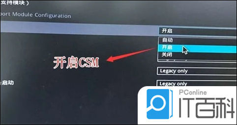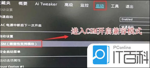4、再返回到" 启动 "的选项,把CSM由disabled改成enabled,开启兼容模式。