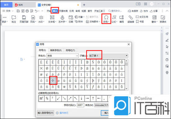 1. 在wps的Word中点击【插入】-【符号】-【拉丁语-1】,然后选择【÷】即可插入除号;