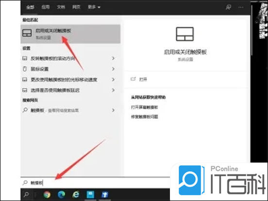 2. 在搜索栏中输入触摸板进行搜索,点击”启用或关闭触摸板”;