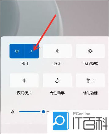 1. 首先我们左键点击右下角任务栏上的“网络”图标,找到“wifi”图标,点击右侧的“小箭头”;