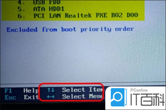 5. 设置BOOT项目接着左左根据下方提示,用箭头调整启动顺序。如图U盘启动是 USBHDD或 USBzip等;