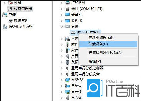 3. 带有ps/2的键盘就是我们目前正在使用的笔记本键盘,右键点击这个选项,选择卸载设备;