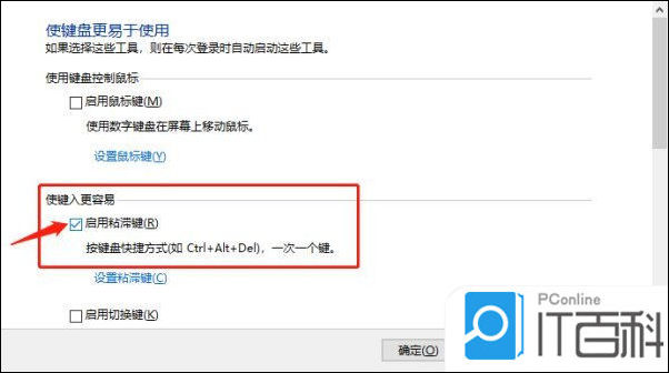 5、 取消勾选“ 启用粘滞键 ”的选项,最后点击确定,就能解锁键盘了。