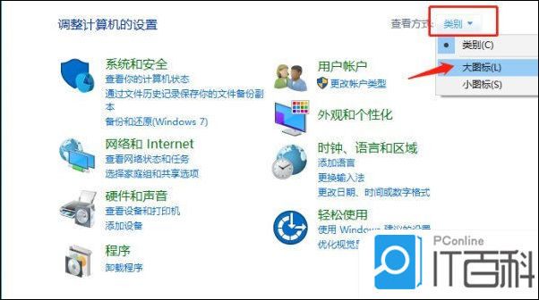 2、 进入控制面板后,在右侧类别按钮中点击选择“ 大图标 ”;