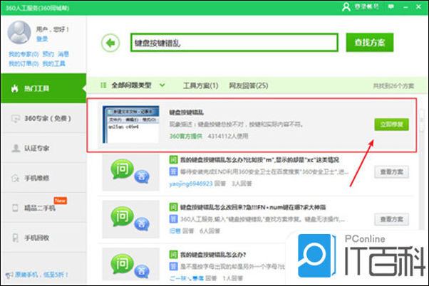 2、 再查找输入“ 键盘按键错乱 ”,然后点击“ 查找方案 ”,在对应的方案点击“ 立即修复 ”即可;