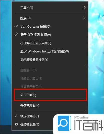 1. 在系统任务栏中单击鼠标右键,在跳出的菜单中选择显示桌面,即可快速回到桌面。