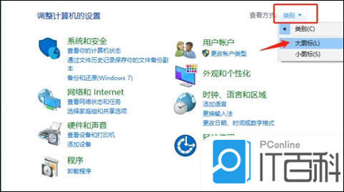 2、打开控制面板,在右侧“类别”按钮处选择“大图标”,如下图所示: