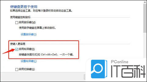 5、取消“启用粘滞键”的勾选项即可,如下图所示: