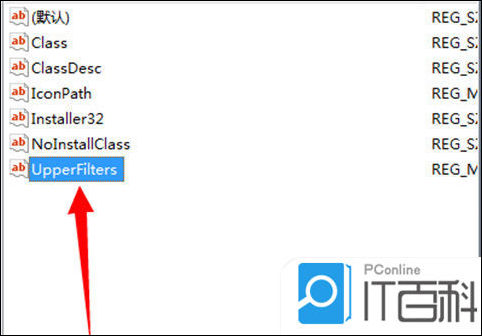 3、接下来就找到class选项,打开里面的4D36E96B选项,找到其右方的UpperFilters,将其删除就好了。