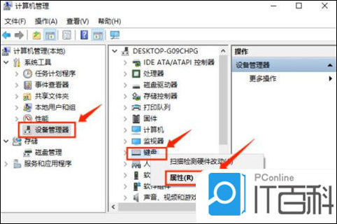 2、在管理界面上,点击左侧的设备管理器,接着右键点击键盘再去点击属性。