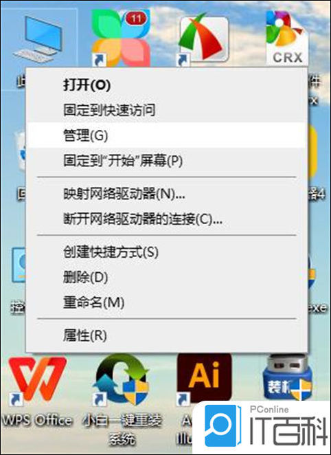 1、首先鼠标右键点击此电脑图标,然后点击管理。