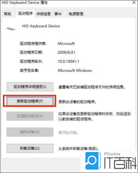 3、在属性窗口中我们选择驱动程序,接着点击更新驱动程序,我们把键盘驱动更新一下去排查这个问题。