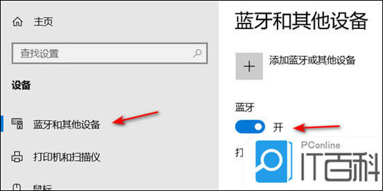 5. 左侧菜单中选择蓝牙和其他设备,打开蓝牙开关;